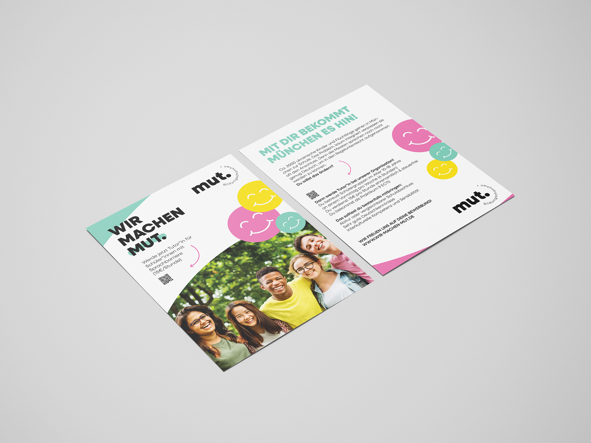 MUT möchte Kindern und Jugendlichen mit Migrationshintergrund des Schulalltag in Deutschland erleichtern. Die Organisation benötigte eine Corporate Design-Auffrischung. Der Name blieb unverändert, jedoch wurden ein neues Logo, sowie neue Farben benötigt, um den Fokus auf bedürftige Kinder aus allen Ländern zu betonen. Ziel war es, ein unverwechselbares Erscheinungsbild zu kreieren. Zusätzlich sollte eine neue Website für MUT entwickelt werden.